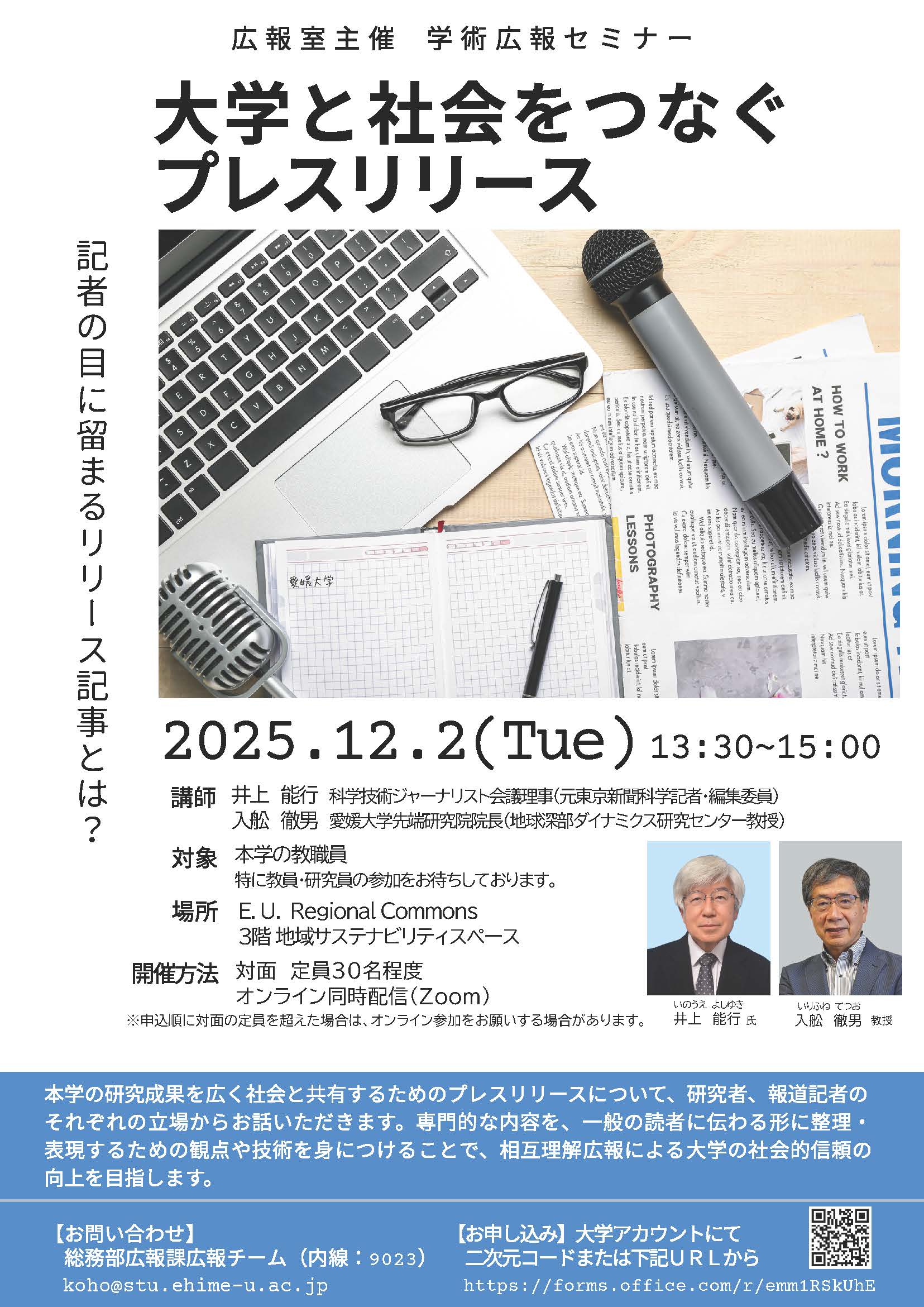 本学の研究成果を広く社会へ共有するためのプレスリリースについて、研究者・報道記者それぞれの立場からお話いただきます。専門的内容を一般の読者に正確に、わかりやすく伝えるための視点や表現を事例を交えて学び、相互理解を深めることで、社会と大学の連携をさらに向上させます。