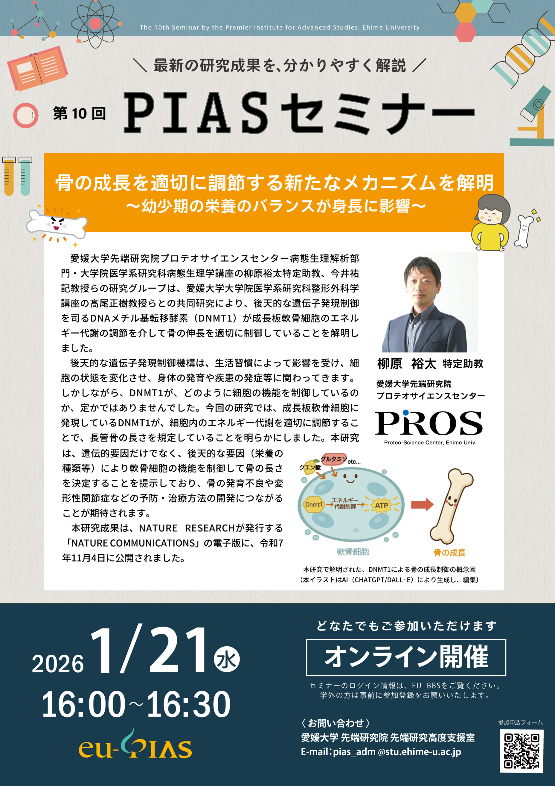 愛媛大学先端研究院プロテオサイエンスセンター病態生理解析部門・大学院医学系研究科病態生理学講座の柳原裕太特定助教、今井祐記教授らの研究グループは、愛媛大学大学院医学系研究科整形外科学講座の髙尾正樹教授、九州大学生体防御医学研究所の馬場健史教授らとの共同研究により、後天的な遺伝子発現制御を司るDNAメチル基転移酵素(Dnmt1)が成長板軟骨細胞のエネルギー代謝の調節を介して骨の伸長を適切に制御していることを解明しました。 後天的な遺伝子発現制御機構は、生活習慣によって影響を受け、細胞の状態を変化させ、身体の発育や疾患の発症等に関わってきます。しかしながら、 Dnmt1が、どのように細胞の機能を制御しているのか、定かではありませんでした。今回の研究では、成長板軟骨細胞に発現しているDnmt1が、細胞内のエネルギー代謝を適切に調節することで、長管骨の長さを規定していることを明らかにしました。本研究は、遺伝的要因だけでなく、後天的な要因(栄養の種類等)により軟骨細胞の機能を制御して骨の長さを決定することを提示しており、骨の発育不良や変形性関節症などの予防・治療方法の開発につながることが期待されます。 本研究成果は、 Nature Researchが発行する「Nature Communications」の電子版に、令和7年11月4日(火)に公開されました。